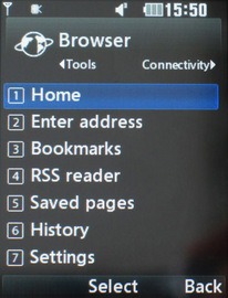 Встроенный браузер поддерживает несложные xHTML странички, а также Javascript, cookies и подгонку страниц под ширину экрана. Изначально в телефоне сохранен только WAP-профиль оператора, а чтобы меньше платить за трафик следует вручную добавить профиль Internet-GPRS. Также присутствует RSS-клиент для чтения новостных лент.