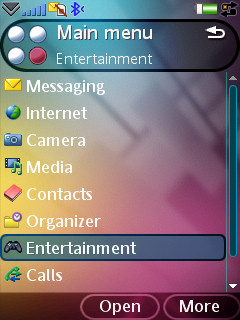 Мультимедийные функции выделены в отдельный раздел с собственным интерфейсом, отличным от остальных функций системы. Точно такое же меню присутствует и в обычных телефонах SonyEricsson. Меню мультимедиа состоит из 6 пунктов, представленных списком. В качестве фона используется анимация с белыми шариками, летающими на черном фоне. Рассмотрим пункты по порядку: