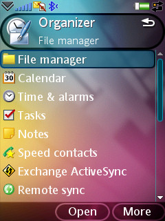 Главное меню вызывается нажатием соответствующего ярлыка на рабочем столе, либо средней софт-кнопкой. Оно состоит из 9 иконок, расположенных сеткой и представленных крупными иконками. Пользователь может добавлять любое количество собственных папок, в этом случае появится вертикальная полоса прокрутки. Также имеется представление основного меню списком, по 8 пунктов на экране. Отметим, что список менее удобен для выбора пунктов пальцем, а для устройства с сенсорным экраном это достаточно важно.