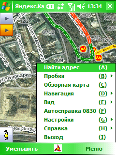 Меню позволяет выполнить поиск адреса, включить отображение пробок, посмотреть миникарту, выбрать вид отображения, обратиться в справочную службу 0830, получить справку о программе. За пунктом «Настройка» скрывается выбор города, настройки GPS-приёмника, а также интересная возможность работы в оффлайн-режиме (данные для карты будут браться из кэша без попыток выхода в Интернет). Наиболее интересные функции спрятаны в пункте «Навигация» главного меню. Здесь можно найти своё местоположение на карте, поработать с личными точками интереса и маршрутами (просмотреть, отредактировать, удалить), активировать работу с пробками.