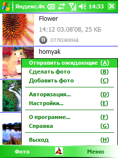Главное меню программы довольно лаконично и позволяет отправить изображения из очереди, сделать фото при помощи встроенной камеры, добавить фото из папки, настроить авторизацию, изменить настройки, получить справку.