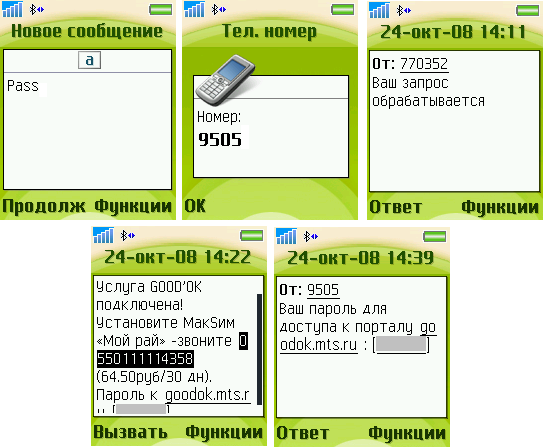 время – sms сообщающее о подключении услуги «GOOD`OK» и паролем от