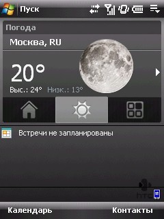 Кроме TouchFlo, заметным отличием от других коммуникаторов на windows mobile является собственная программа HTC Home, заменяющая стандартный виндовый экран «Today». Сверху расположены красивые и большие часы, чуть ниже – три панельки – для доступа к почте, смскам и пропущенным звонкам, для просмотра погоды и, наконец, для быстрого доступа к устанавливаемым пользователям приложениям .