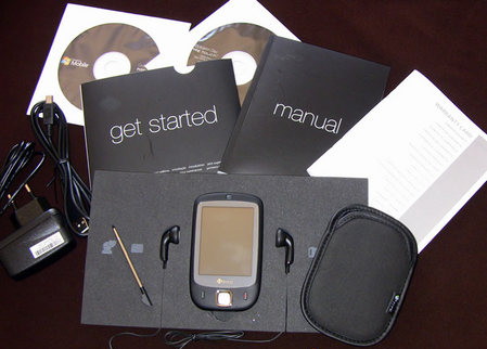 Упаковка девайса была удобной и стильной, очень хотелось поскорее раскрыть ее и заглянуть внутрь. Комплектация оказалась стандартной, но то, как все было красиво упаковано, сразу навело на мысль, что к дизайну своего детища создатели подошли очень основательно. Позже мы в этом еще удостоверимся, ну а пока посмотрим, что же ребята из HTC положили в стильную черную коробочку. Кроме самого аппарата в комплект входит гарнитура, аккумулятор, два диска с программным обеспечением, красивый чехол из кожезаменителя и кабель для связи с компьютером.