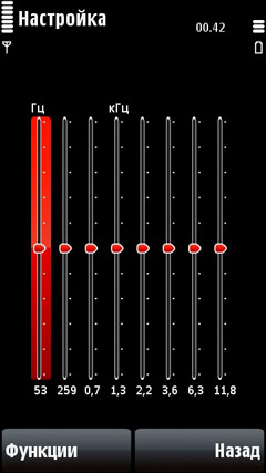 На левую софт-кнопку назначено меню Функции, здесь можно включить случайное воспроизведение и повтор, настроить эквалайзер. Эквалайзер имеет 5 предустановок, поддерживается и ручная настройка – по 8 полосам, ±5 значений. Также в меню присутствует настройка звука, а именно баланс, расширение стерео и увеличение громкости – все, как в обычных смартфонах Nokia.