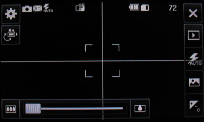 Интерфейс съемки интуитивно понятен. При съемке на экране отображаются: значки состояния сверху, кнопки выбора режимов и отдельных параметров справа, кнопки настроек и перехода в режим видеосъемки слева, регулировка зума снизу, вспомогательная рамка по центру - именно на попадающий в нее объект будет производиться фокусировка. При нажатии на экран в любом свободном месте почти все элементы скрываются, что, в общем-то, не сильно влияет на видимую область – основной объект все равно находится в центре, а кнопки полупрозрачные. Кстати, из-за того что соотношение сторон у экрана и фотографии разное, а видоискатель занимает весь экран, во время съемки изображение несколько обрезано сверху и снизу и на конечной фотографии видно будет чуть больше. Все кнопки интерфейса крупные и легко нажимаются пальцами. Не понравилась разве что регулировка зума - просто взять и потянуть ползунок в нужную сторону нельзя, обязательно нужно пользоваться экранными кнопками или кнопками регулировки громкости.