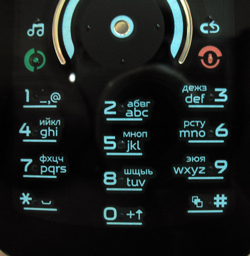 Но на этом приятные сюрпризы от клавиатуры не заканчиваются. Технология ModeShift позволяет телефону превращаться то в плеер, то в камеру. Каким образом? Привычные цифровые кнопки исчезают, а вместо них появляются кнопки управления плеером или камерой. Причем появляются не на месте обычных кнопок, а между ними. С технической точки зрения, это реализовано при помощи трафаретов, которые активируются в нужный момент, высвечивая нужные обозначения кнопок. К видимым в режиме ожидания 23 кнопкам добавляются еще 5 для режима плеера (перемотка вперед и назад, пауза, активация повтора и перемешивания) и 4 для камеры (увеличение и уменьшение масштаба, переход в галерею и переключение фото/видео режимов). Всего получается, что на лицевой панели расположены 32 кнопки и сенсорное колесо. Если бы не технология ModeShift, то все они просто мешали бы друг другу. Перспективы дальнейшего развития этой технологии велики, например, вместо трафаретов можно использовать отдельные экранчики для каждой кнопки, отображающие ту функцию, которая нужна в данный момент.