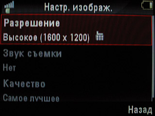 Запустить камеру можно нажатием левой боковой кнопки. Если же ее нажать и удерживать, то сразу будет сделан снимок. Интерфейс съемки простой, не перегруженный ненужными функциями. В верхней строке отображаются статусные иконки – режим фото или видео, количество оставшихся снимков, место хранения, разрешение. В нижней – подписи к софт-кнопкам, Функции и Назад соответственно. В левом нижнем углу – индикатор быстрых настроек, изменяемых навигационной кнопкой. С ее помощью можно выбрать режим съемки (автоматический, ночной или ручной) и стиль (цветной, черно-белый, старинный, негатив, красноватый, синеватый, зеленоватый), а в ручном режиме съемки вдобавок настроить экспозицию и баланс белого. В меню функции включается автотаймер (5 или 10 секунд) и непрерывная съемка (4, 6, 8 снимков). Там же есть пункт Настройка камеры, в котором задаются время просмотра, имя и место хранения снимков, автосохранение и автоотправка, и пункты с раздельными настройками для фото и видео. Для фото можно выбрать разрешение (от 160х120 до 1600х1200), звук съемки и качество. Для видео настройки те же, только разрешение может быть 96х128 или 144х176, и можно ограничить длительность для отправки ролика по MMS.