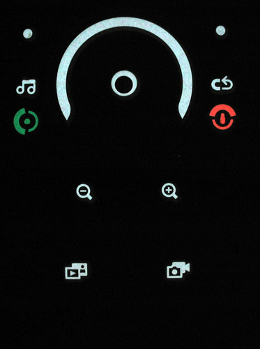 Кроме цифровых кнопок, присутствуют также две софт-кнопки, клавиша вызова плеера, клавиша возврата назад, клавиши приема и отбоя, пятипозиционная навигационная кнопка. Подсветка всех кнопок белая, за исключением приема и отбоя – они по традиции подсвечены зеленым и красным цветом соответственно. В качестве навигационного элемента, помимо пятипозиционной кнопки, используется сенсорное колесо Omega Wheel. Колесо разомкнутое, нижняя четверть отсутствует, что делает его похожим на греческую букву омега, откуда и пошло название. Действует оно привычным образом – осуществляет прокрутку меню и списков. То, что нижняя часть колеса отсутствует и не реагирует на движение пальца, не влияет на удобство использования. Причем можно задерживать палец в нижних точках колеса, и прокрутка будет продолжаться автоматически.
