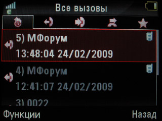 Журнал вызовов открывается при нажатии на зеленую кнопку, он состоит из пяти разделов, переключение между которыми осуществляется с помощью горизонтальных закладок. Это общий список последних вызовов, списки пропущенных, набранных и принятых звонков, а также наиболее часто используемые. С помощью меню "Функции" вызываются счетчики разговоров и GPRS, а также переключается режим просмотра - списком или эскизами, в последнем случае отображается более подробная информация, а именно время и дата вызовов.