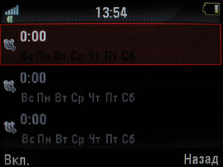 Функциональность будильника высока - можно задавать дни срабатывания, период повторения сигнала (функция "дремать"), мелодию и громкость сигнала. Всего устанавливается до трех будильников.