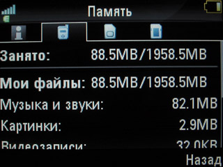 Объем внутренней памяти, доступный пользователю для хранения данных составляет около 2 гигабайт, если точнее, то 1958 мегабайт. Этого достаточно для хранения около 270 композиций в формате MP3. Если этого недостаточно, можно расширить память при помощи карты памяти формата Micro-SD. Поддерживаются карточки объемом до 4 Гб, то есть более емкие флешки Micro-SDHC не подойдут. Слот расположен под задней крышкой, для замены карточки приходится извлекать аккумулятор – о горячей замене речь не идет.