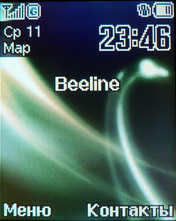В режиме ожидания на экране отображается статусная строка в верхней части (дата и время) и в нижней части (меню, контакты), причем последняя прозрачна.