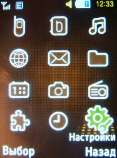 Главное меню состоит из 12 иконок (3х4), при выборе которых происходит переход к горизонтальным спискам подменю.