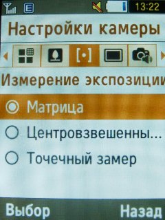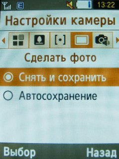 Основные настройки включают в себя: качество – наилучшее, отличное, обычное; режим съёмки – обычный, ночной; измерение экспозиции – матрица, центровзвешанный, точечный размер; сделать фото – снять и сохранить, автосохранение; звук затвора – выключено, затвор 1, 2, 3; звук масштабирования – включено/выключено; звук изменения яркости – включено/выключено; сохранение по умолчанию – телефон, карта памяти; имя по умолчанию – фото.