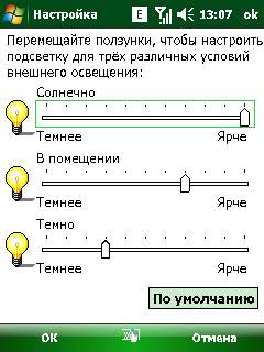 Упомянутый ранее датчик освещённости автоматически подстраивается под внешние условия освещения. В настройках можно регулировать работу подсветки следующим образом: выключать, если устройство не используется в течение 10 сек., 30 сек., 1, 2, 3, 4 или 5 минут; включать/невключать подсветку при нажатии кнопки или касании экрана; автоподстройка с учётом заряда батареи; автоподстройка с учётом времени бездействия и самостоятельная регулировка подсветки.