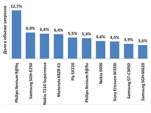 Среди телефонов подороже бюджетников в августе десятку заполнили самые разные устройства от «неактуальных» производителей: здесь и Philips, и Motorola, и Fly – в первой пятёрке производителей их не сыщешь. И разбежки в рейтинге были невелики, за исключением двукратного преимущества лидера над конкурентами.