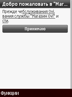 При первом запуске «Магазина Оvi» необходимо принять условия использования сервиса и разрешить данному приложению доступ в Интернет. Пользовательский интерфейс «Магазина Оvi» во многом схож с интерфейсом web-версии сервиса – присутствует разбивка контента на категории, поиск и возможности фильтрации списка отображаемого контента. Для доступа к основным возможностям приложения служит меню «Функции», вызываемое левой софт-клавишей.