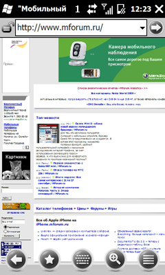 Не секрет, что стандартный браузер Internet Explorer достаточно сильно отстал в развитии от своих конкурентов. Поэтому лидерство на коммуникаторах с Windows Mobile завоевала программа Opera. И новая версия IE6, представленная вместе с WM 6.5, ориентируется в первую очередь на «Оперу». Впрочем, интерфейсы и принципы работы большинства современных браузеров для различных платформ похожи. Итак, окно программы выглядит так: сверху строка заголовка, под ней адресная строка с кнопкой перехода, а внизу – пять круглых кнопок. Их функции: переход на страницу назад, открытие закладок, отображение экранной клавиатуры, отображение ползунка масштаба, открытие меню программы.