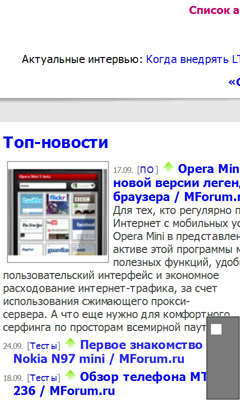 Меню представлено в виде списка пунктов. Из меню можно перейти на домашнюю страницу, открыть историю посещения сайтов, перейти на страницу вперед или обновить текущую, выключить показ изображений, перейти в настройки программы или выйти из нее. Пункты меню подписаны буквами: их можно вызывать с помощью виртуальной или аппаратной (если она присутствует) клавиатуры. После загрузки сайта все элементы управления скрываются, остается только сама страница, а также прямоугольник в правом нижнее углу – он показывает, какая именно часть страницы в текущий момент отображается на экране. Перемещаться по странице можно простыми жестами – движениями пальца по экрану. Раньше в IE такой возможности не было.