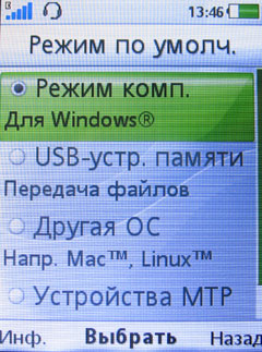 Подключать аппарат к ПК вы можете в 4 режимах: «Режим компьютера» (для подключения к ПК с ОС Windows), съемный диск (все функции телефона, кроме будильника и сигналов календаря, отключаются на время передачи файлов), «Другая ОС» (для подключения, например, к устройствам на MAC или Linux) и «Устройства МТР» (для передачи только мультимедийных файлов). Когда вы подключаете девайс как съемный диск, то происходит его перезапуск, на который уходит примерно 30 секунд. Дальше система автоматически опознает его и выводит на экран содержимое как самого телефона, так и карты памяти.