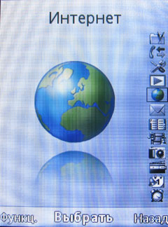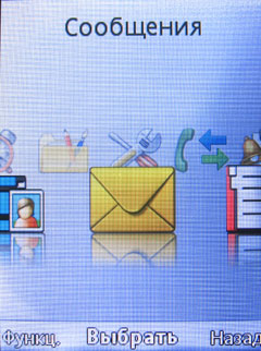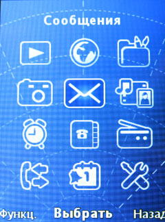 Оно имеет вполне традиционный для «сонериков» вид. Конкретный вариант иконок зависит от выбранной темы, а способов их отображения три: матрица 3х4, горизонтальное «кольцо» либо же одна иконка в центре с панелью остальных справа. Все подпункты выглядят в виде списков; в ряде случаев реализованы меню-закладки, облегчающие работу с телефоном (например, меню «Диспетчер файлов»). Из 3 предустановленных тем две выдержаны в одном стиле; если стоит одна из них, то перемещение между пунктами основного меню сопровождается легким вибросигналом. Все подпункты выглядят только в виде списков. При навигации возврат на пункт выше происходит правой софт-кнопкой (левая отвечает обычно за меню «Функции» и подсказки), а выход в режим ожидания – кнопкой сброса. Когда вы находитесь на рабочем столе, то левая софт-клавиша по умолчанию активирует справочник, а правая - поисковик Google; перепрограммировать их нельзя.