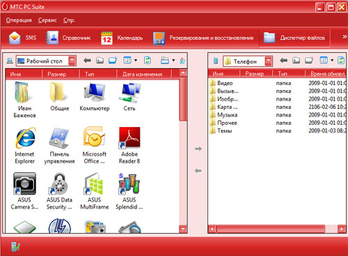 Пункт «Диспетчер файлов» предназначен для обмена файлами между телефоном и ПК. Он реализован в виде двух окон: в левом - содержимое компьютера, в правом - телефона. Нужные файлы вы просто перетаскиваете из одного окна в другое, и все. Правда, операция занимает несколько больше времени, чем если вы делаете это в режиме съемного диска.