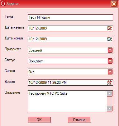 Меню «Календарь» позволяет планировать расписание и создавать новые события. Для новой задачи, например, указывается тема, даты начала и окончания, приоритет, статус, сигнал и текстовое примечание.