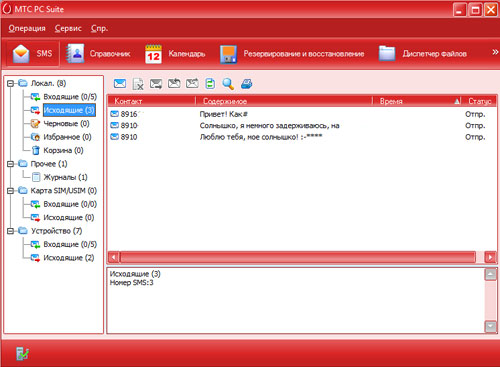Центр SMS-сообщений позволяет вам создавать и отправлять сообщения непосредственно с экрана ПК. Кроме этого, доступна распечатка текста нужных вам сообщений (иконка принтера) и поиск в папках. На экран выводится банк сообщений как телефона, так и SIM-карты; управлять ими можно с помощью «дерева» в левой части окна приложения. В память ПК будут сохраняться сообщения, помещенные в корневой папке «Локальные»; отдельные папки в ней предназначены для входящих, исходящих, черновиков, избранного и корзины. Есть также журналы сообщений. Для телефона и SIM-карты имеются только папки «Входящие» и «Исходящие». В основном окне отображаются номера абонентов, правее - текст, время и статус сообщения. Доставка и прием ответов происходят исправно, подтверждение доставки также работает без нареканий.