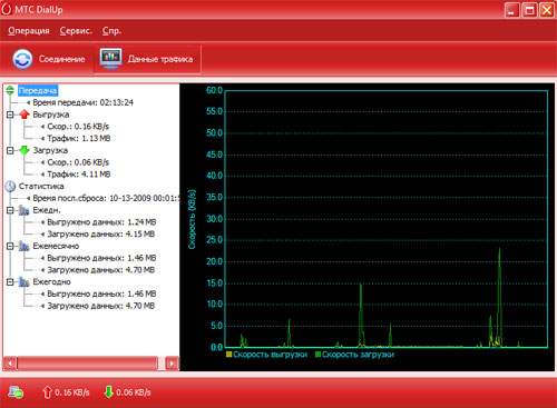 Вторая вкладка - это статистика интернет-соединения. Здесь автоматически отслеживается общее время сеанса, скорость и объем входящего и исходящего трафика. Фиксируется время последнего сброса данных, а также объемы выгруженного и загруженного трафика за день (ежедневные), за месяц и за весь год. Динамика текущего интернет-соединения отображается на графике в основном окне, что называется, «в прямом эфире»; скорость загрузки и выгрузки обозначаются на нем разными цветами для облегчения ориентирования. Так что, полагаем, по части статистики даже самый требовательный пользователь будет удовлетворен.