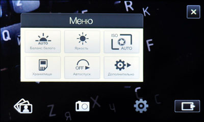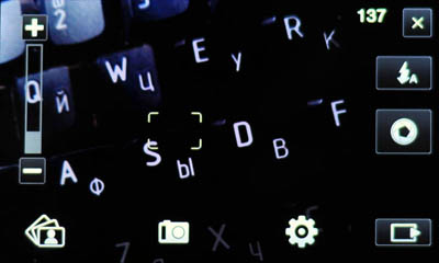 Помимо кнопки спуска, на экране отображается кнопка выбора режимов работы вспышки – (авто, вкл, выкл) и кнопка, открывающая доступ к меню съемки. В этом меню три кнопки, которые находятся в нижней части экрана, это переход в галерею фотографий, изменение режима и вызов настроек. Также слева есть ползунок зуммирования, а в правом верхнем углу кнопка выхода и количество оставшихся кадров. Режимов съемки 6: фото, видео, панорама, MMS-видео, фото контактов. Названия говорят сами за себя. Настройки делятся на основные, которые отображаются во всплывающем окошке – баланс белого, яркость, ISO (авто, или от 100 до 800 единиц), выбор места хранения, автоспуск. Здесь же находится кнопка для перехода к дополнительным настройкам, которые состоят из 5 вкладок по 4 пункта. Здесь можно настроить такие опции, как разрешение (от 320х240 до 2592x1944), качество, широкоэкранность (снимки немного обрезаются для того, чтобы занимать всю площадь экрана – для 5Мп разрешение составит 2592x1552 вместо 2592x1944), длительность просмотра, звук затвора, эффект и некоторые другие. Стоит отметить логичную организацию интерфейса, когда на экране нет ничего лишнего, а основные настройки отделены от второстепенных, которые можно настроить один раз и забыть про них. Кнопки интерфейса крупные и легко нажимаются пальцами.