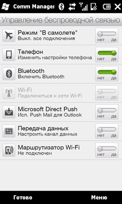 Отдельной клавиши выключения в коммуникаторе нет, она совмещена с кнопкой отбоя. При этом несколько поменялись функции этой кнопки – при нажатии кнопки отбоя в любом из приложений дисплей отключается и блокируется: при последующем нажатии любой из лицевых аппаратных кнопок мы попадаем на экран разблокировки, а затем возвращаемся в то же самое приложение. Если же удерживать кнопку отбоя, то появится меню, из которого можно выключить устройство, заблокировать его, включить беззвучный режим или разорвать GPRS-соединение. Возможности назначить какое-либо одно из этих действий на удерживании кнопки нет, всегда будет появляться это меню.