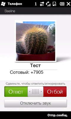 При входящем звонке на экране, помимо фотографии и номера абонента, отображается ползунок, который нужно сдвинуть влево для ответа на звонок, либо вправо для отбоя. Под ползунком находится кнопка для отключения звука без ответа или сброса вызова. Использование ползунка более надежно защищает от случайного ответа или сброса, нежели обычные кнопки. После завершения разговора предлагается сохранить номер в справочнике в случае, если он там отсутствует.