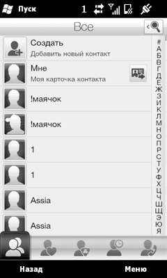 Переход к полной адресной книге происходит при нажатии левой софт-кнопки, правая же вызывает меню, с помощью которого можно удалить контакт из избранных или изменить фотографию. Адресная книга также является частью оболочки, стандартный интерфейс Windows Mobile практически не используется. Справочник состоит из нескольких вкладок: все контакты, основные контакты, группы, обновления, журнал вызовов. На первой расположены все контакты в алфавитном порядке. Справа присутствует столбик с русским алфавитом для быстрого перехода к нужной букве; можно как выбирать букву, так и пролистывать каталог движением пальца по этому столбцу. Также присутствует поиск по имени и фамилии, для перехода к нему нужно нажать кнопку в правом верхнем углу программы.