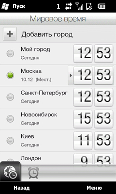 При нажатии на часы появляется окно программы Мировое время, в котором отображается текущее время в различных городах мира; список городов можно редактировать. Вторая вкладка программы позволяет устанавливать будильники, до трех штук.