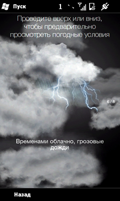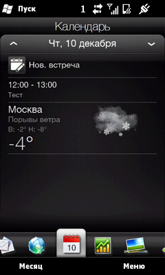 В качестве фонового рисунка раньше можно было установить только статическую картинку, но в новой версии поддерживаются и анимированные обои. В прошивке имеются три таких картинки. Выглядят они красочно. Разумеется, можно выбрать и обычное изображение, без анимации. Еще один вариант фонового изображения, самый эффектный – так называемые погодные обои. При их установке на рабочий стол накладывается анимация, соответствующая прогнозу погоды. При дожде, например, на экране отображаются капельки, а затем их стирают автомобильные «дворники». При снеге углы рабочего стола покрываются инеем, замерзают. Выглядит это очень интересно, моментально привлекает внимание. Упор на анимацию погодных эффектов присутствует в рекламе коммуникаторов HTC еще с выхода модели Touch Diamond. Все варианты фоновых изображений действительны только для главной вкладки рабочего стола, у всех остальных фоном является черная картинка с небольшим градиентом.