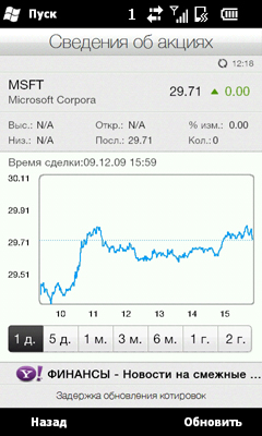 Эта вкладка служит для отображения текущих котировок ценных бумаг различных компаний. В настройках задается период автообновления информации. Подробная информация об акциях включает в себя максимальное и минимальное значение курса, а также график изменения за выбранный период – от 1 дня до 2 лет.