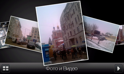 Вкладка позволяет просматривать фотографии с камеры. Они отображаются в виде стопки, из которой выбрана одна фотография – она показывается под небольшим углом к экрану. Перелистывание осуществляется привычным уже жестом, сопровождается анимацией. Для показа фотографий друзьям использовать вкладку неудобно, лучше использовать полноэкранный просмотр. Находясь на этой вкладке, можно повернуть коммуникатор в альбомный режим. Интерфейс автоматически переориентируется. Фотографии в этом режиме представлены лентой, их можно быстро листать жестами пальца. В правом нижнем углу экрана находится кнопка для запуска слайд-шоу.