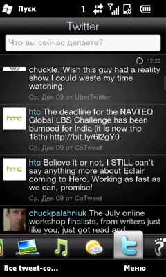 Это новая вкладка, которой не было в предыдущих версиях интерфейса. Она используется для доступа к одноименному сервису – микроблогам Twitter. Отличие этого сервиса от обычных блогов – короткие сообщения, в основном о каком-то действии, выполняемом в данный момент. На этой вкладке отображаются последние записи ваших друзей, отсюда же можно отправить собственную запись.