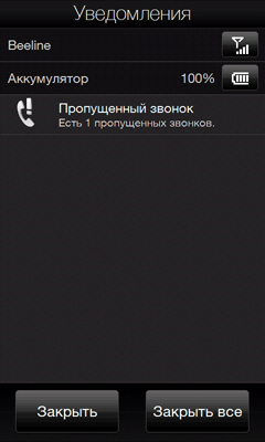 При нажатии на статусную строку открывается окно «Уведомления», в котором появляются различные события, например пропущенные звонки, непрочитанные сообщения, уведомления календаря и прочие. При нажатии на иконку уровня сети открывается программа CommManager. Уровень заряда батареи отображается в процентах, но с шагом в 10%. Все уведомления можно удалить нажатием одной кнопки.