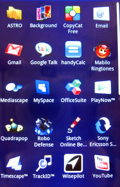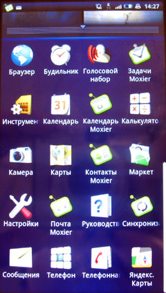 Главное меню представлено как набор иконок, в котором каждая назначена отдельному приложению или программе. Чтобы активировать его с рабочего стола, нужно «потянуть» за «закладку» со стрелочкой внизу экрана. Пальцами управлять удобно; размер иконок достаточно велик, так что при нажатии соседние иконки не задеваются. Чтобы прокрутить меню вверх-вниз, достаточно одного «пролистывающего» движения пальца. Приложения органайзера (будильник, калькулятор, календарь) не собраны все в одном меню, а выделены в отдельные пункты.