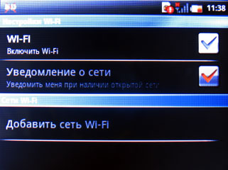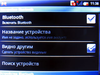Управление беспроводными интерфейсами идет первым пунктом в меню «Настройки». Здесь отдельные пункты предназначены для Wi-Fi и Bluetooth, хотя меню обоих интерфейсов организовано одинаково: строка активации, поиск новых сетей/устройств, уведомления о новых сетях/устройствах. Для Bluetooth в опциях есть также изменение названия устройства и режима видимости. Все беспроводные интерфейсы можно при желании быстро отключить (режим полета).