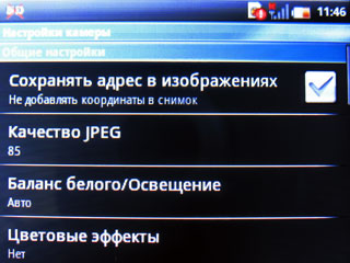 Как на любом «андроиде», снимки и видеоролики записываются только на карту памяти. Нет ее в аппарате – от камеры проку мало. Включается съемка из главного меню; боковых кнопок для запуска камеры нет. Видоискатель при съемке занимает весь экран; меню опций вызывается кнопкой главного меню (вторая слева от трекбола). Настройки вполне традиционны для «среднестатистической» камеры: автофокус (хотя резкость не на высоте), геотеггинг (привязка снимков к местности), 4 градации качества, баланс белого (авто, лампа накаливания, лампа дневного света, дневной свет, облачно), эффекты (ч/б, сепия, негатив, черный фон, белый фон, соляризация, вода), изменение разрешения (1600х1200, 1280х960, 640х480, 320х240 точек), анти-мерцание, показ снимка, сетка, отключение звука затвора, обнуление счетчика кадров, а также сброс до заводских настроек. Что касается видео, то здесь можно выбирать формат записи (.мр4, .3gp) и качество ролика (2 градации). Цифровой зум также присутствует, но он, как и всегда в подобных случаях, реализован больше «для галочки».