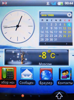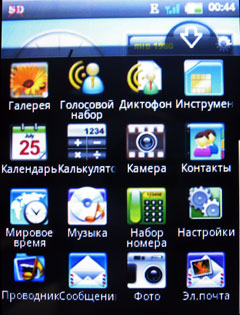 Главное меню вызывается либо простым касанием пальца нижней части экрана, либо кнопкой со стрелочкой. Выглядит оно как набор иконок, вид которых сразу вызывает в памяти иконки меню «айфона» или, например, некоторых аппаратов Samsung. Доступно в общей сложности 23 пункта: Facebook, GPS-трекер, RSS-клиент, блокнот, браузер, будильник, видео, галерея, голосовой набор, диктофон, календарь, калькулятор, камера, контакты, мировое время, музыка, набор номера, настройки, проводник, сообщения, фото, электронная почта. Все подпункты выглядят в виде списков.