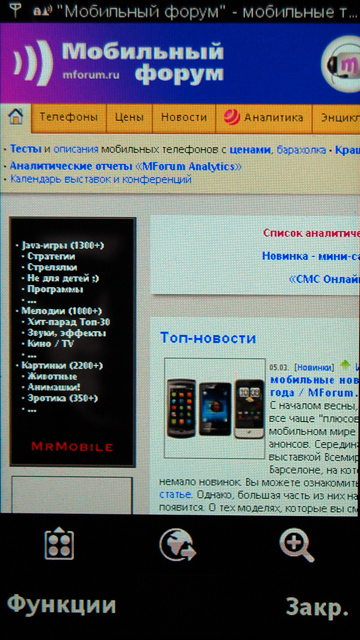Vivaz оснащен встроенным браузером для серфинга в интернете, причем поддерживается удобный быстрый доступ к PlayNow, Accessories, Sony Ericsson home, Support, поиску в Google. Желающие смогут поставить и Opera Mobile 10, который можно скачать с Opera.ru (m.opera.com) непосредственно в телефон и тут же установить. В ходе работы с браузером проблем не возникало, страницы загружались корректно, в том числе и русскоязычные. Добавьте к этому дружественный интерфейс и высокую скорость загрузки страниц. В настройках Opera можно выбрать пункт Opera turbo, при этом все страницы будут сжиматься на сервере, уменьшая ваш трафик и ускоряя работу в мобильном интернете.