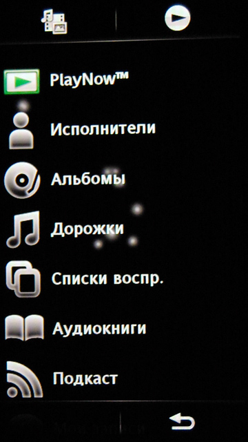 Плеер смартфона можно вызвать как через меню, так и через виджет, разработанный Sony Ericsson. В главном меню музыки можно выбрать: