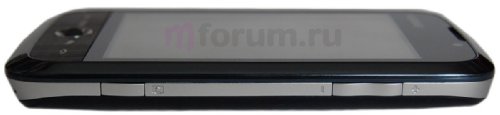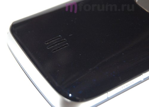 В верхней части лицевой панели, над экраном аппарата в корпусе предусмотрена широкая прорезь, за которой расположен разговорный динамик, прикрытый тонкой сеточкой (такая же защищает динамик громкой связи). Справа находится фронтальная камера, удобная для видеовызовов в сети 3G.