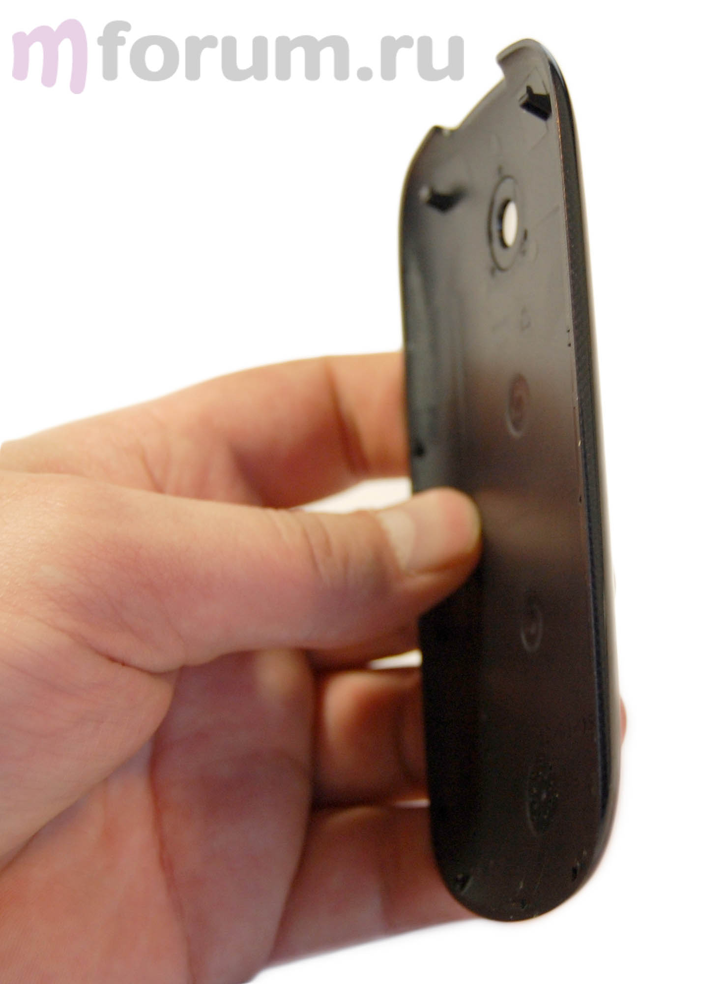 На задней стороне телефона расположена камера. Вырез под нее в крышке - круглый. Динамик громкой связи здесь также внизу, там, где небольшие круглые отверстия.