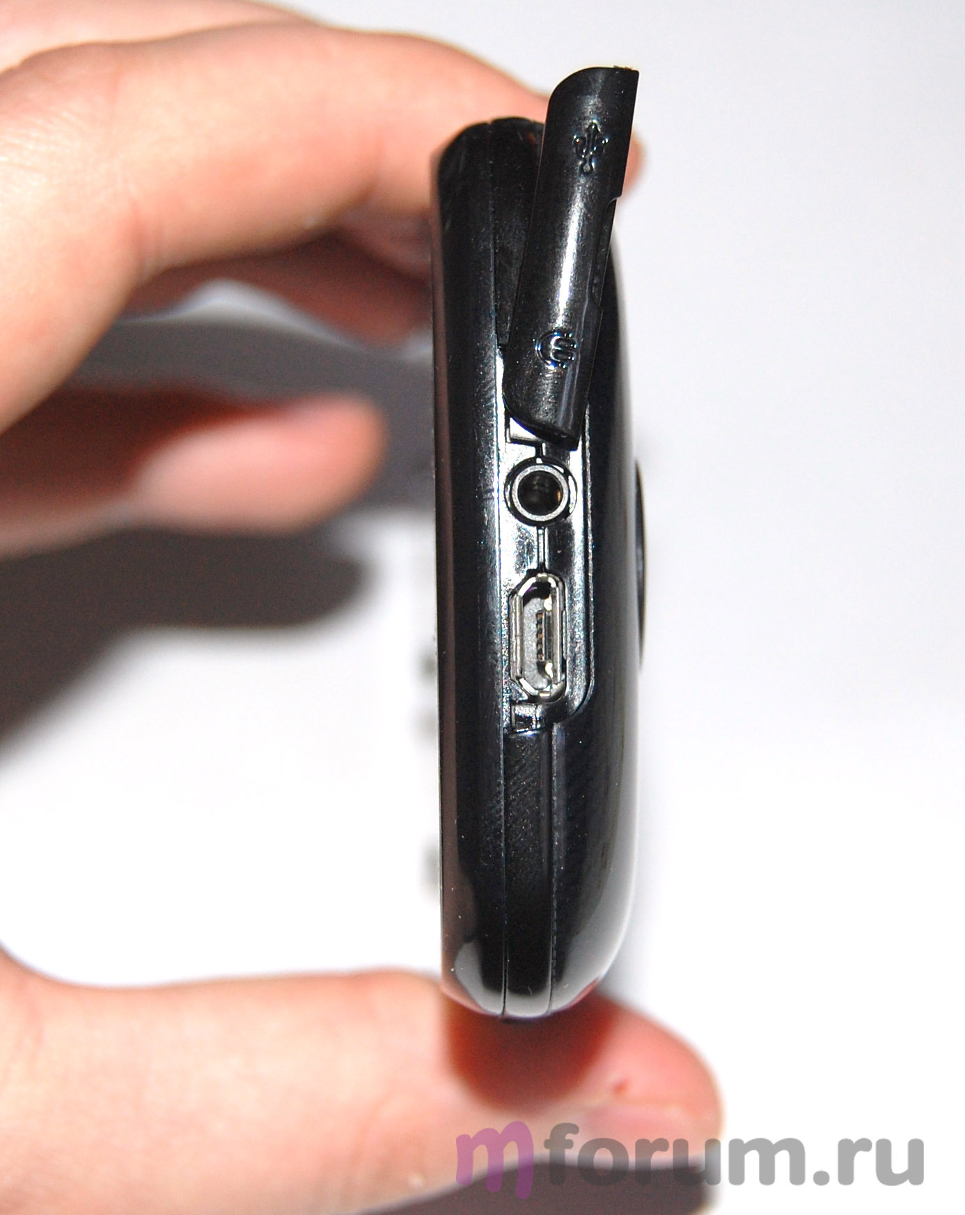 На верхнем торце находится собраны разъемы: microUSB и разъем под гарнитуру или наушники (2.5 мм). Оба разъема прикрыты единой пластиковой заглушкой на небольшом гибком шлейфе.