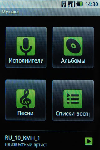 В главном меню есть пункт «Музыка», его и запускаем. Перед нами открывается программа, можно выбрать – исполнители, альбомы, песни, список воспроизведения.